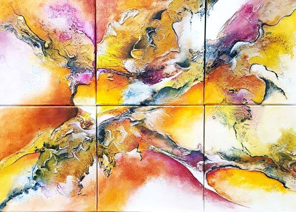Be happy 6-luik in 1 baklijst (kunnen ook los) 60x90cm Mixed media op doek Verkocht